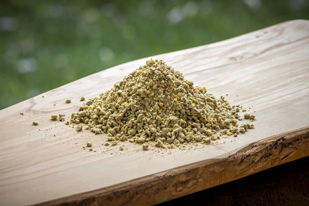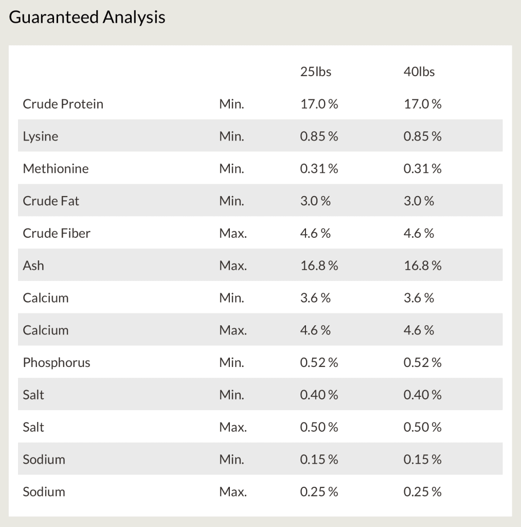 Organic Corn, whole, Organic Soybean Meal, Organic Peas, whole, Organic Wheat, whole, Ground Limestone, Organic Sun-dried Alfalfa Pellets, Organic Flaxseed, Monocalcium Phosphate, Diatomaceous Earth, Organic Kelp, dried, Hydrated Sodium Calcium Aluminosilicate, Sodium Aluminosilicate, Salt, Organic Tagetes Meal (Aztec Marigold), DL-Methionine, Choline Chloride, Organic Flavors (Garlic, Horseradish, Anise Oil, Juniper Berries Oil), Hydrolyzed Yeast, Ferrous Sulfate, Manganese Oxide, Zinc Oxide, Niacin Supplement, Copper Sulfate, Sodium Selenite, d-alpha Tocopheryl Acetate, Riboflavin Supplement, Calcium Pantothenate, Vitamin D3 Supplement, Vitamin A Supplement, Pyridoxine Hydrochloride, Dried Talaromyces Versatilis Fermentation Product, Vitamin B12 Supplement, Menadione Nicotinamide Bisulfite, Ethylenediamine Dihydriodide, Folic Acid, Biotin.
