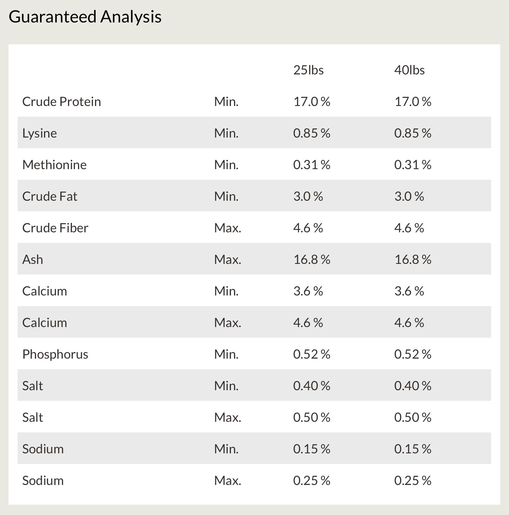 Feed this ration free-choice to all laying poultry as a complete feed. It can be fed starting at 15-18 weeks of age. Provide plenty of clean, fresh water at all times.