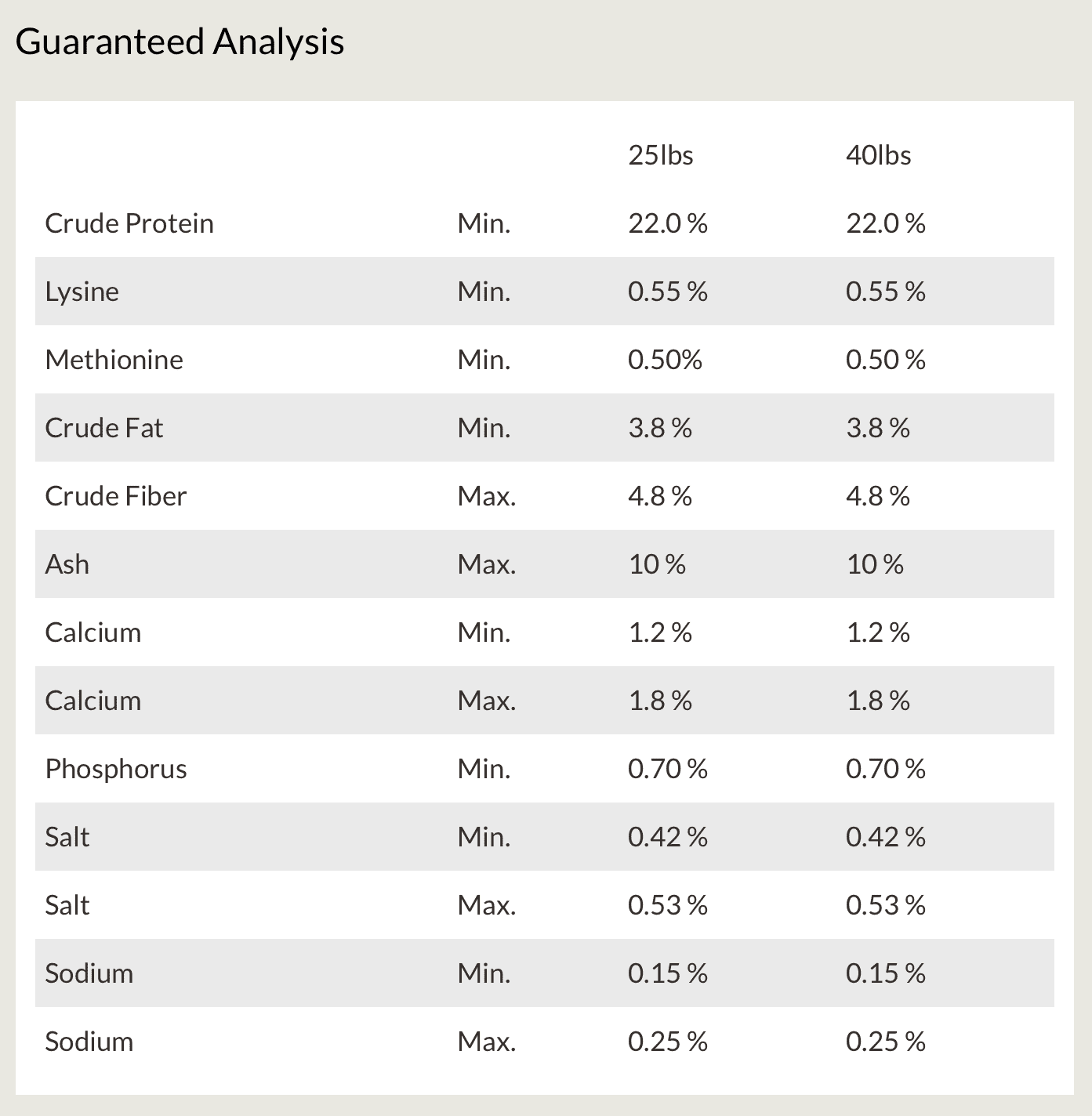Organic Wheat, whole, Organic Sesame Meal, Organic Peas, Organic Barley, whole, Ground Limestone, Monocalcium Phosphate, Organic Flaxseed, Organic Kelp, dried, Hydrated Sodium Calcium Aluminosilicate, Diatomaceous Earth, Sodium Aluminosilicate, Salt, DL-Methionine, Choline Chloride, Organic Flavors(Garlic, Horseradish, Anise Oil, Juniper Berry Oil), Hydrolyzed Yeast, Ferrous Sulfate, Manganese Oxide, Zinc Oxide, Niacin Supplement, Copper Sulfate, Sodium Selenite, d-alpha Tocopheryl Acetate, Riboflavin Supplement, Calcium Pantothenate, Vitamin D3 Supplement, Vitamin A Supplement, Pyridoxine Hydrochloride, Dried Talaromyces Versatilis Fermentation Product, Vitamin B12 Supplement, Menadione Nicotinamide Bisulfite, Ethylenediamine Dihydriodide, Folic Acid, Biotin.