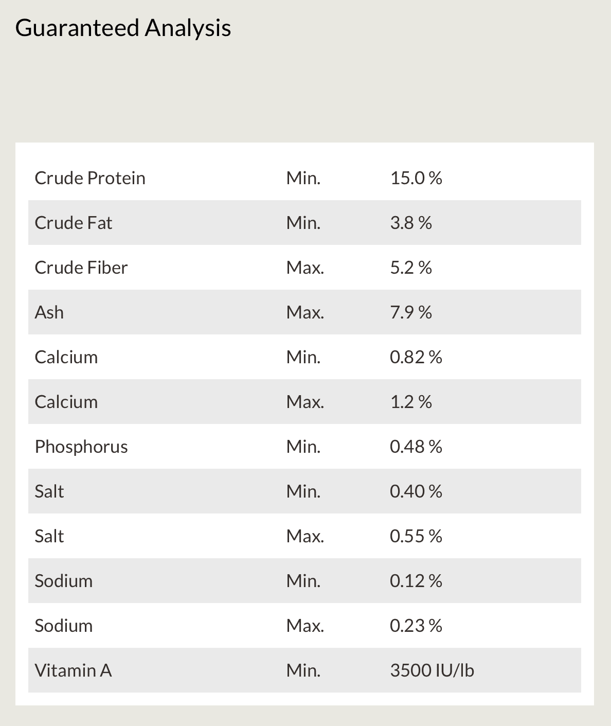 Feed 0.4 – 1.0 lbs per 100 lbs. body weight per day with forage. Do not feed more than 5.0 lbs at a single feeding. Provide fresh, clean water at all times.