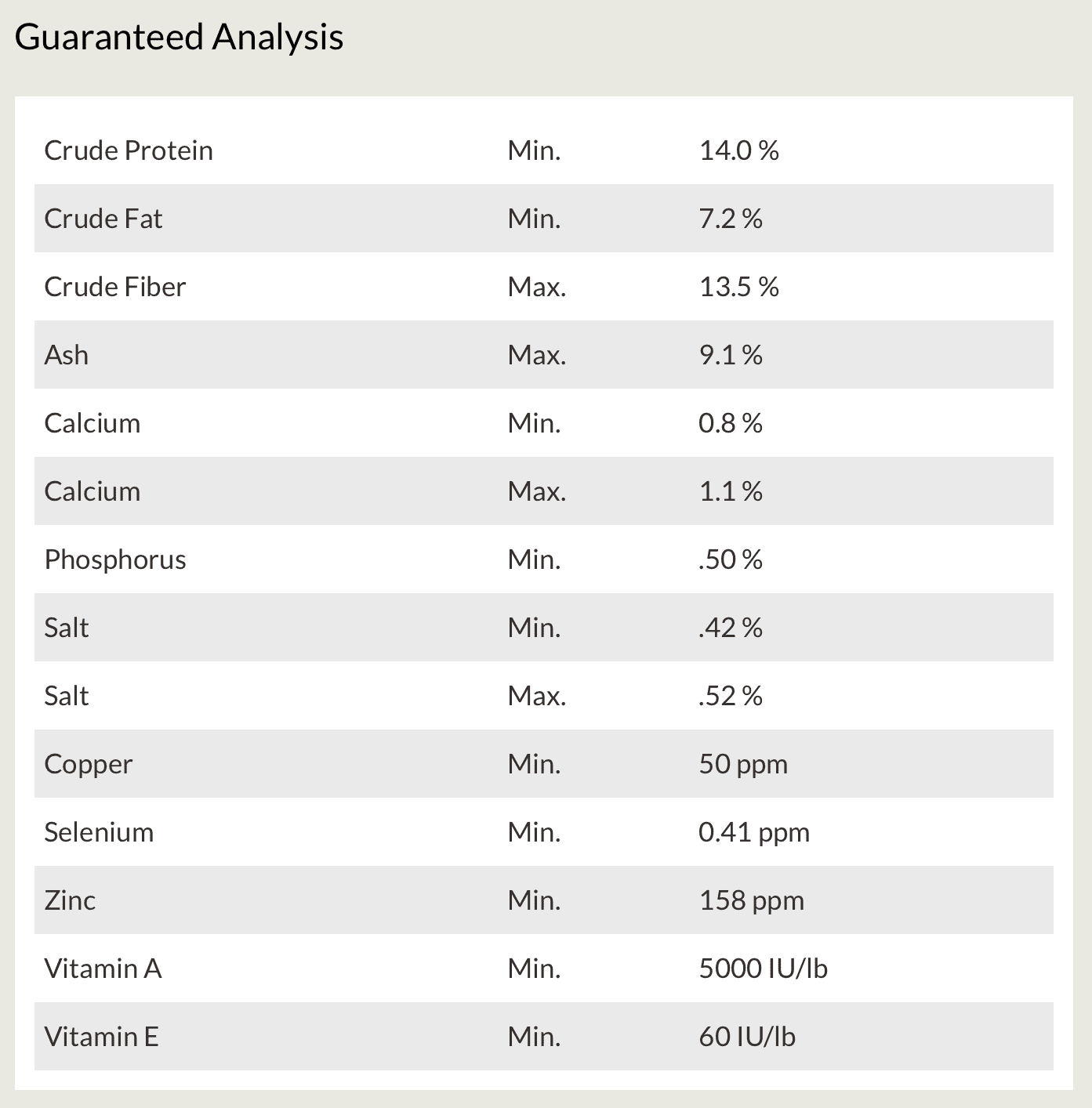 Organic Sun-dried Alfalfa Pellets, Organic Wheat Millrun, Organic Oats whole, Organic Coconut Meal, Organic Sesame Meal, Organic Peas, Organic Carrot Pellets, Organic Flaxseed, Organic Sunflower Seeds whole, Ground Limestone, Salt, Hydrated Sodium Calcium Aluminosilicate, Diatomaceous Earth, Monocalcium Phosphate, Sodium Aluminosilicate, Organic Kelp, dried, Saccharomyces cerevisiae yeast, Organic Flavors(Garlic, Thyme, Anise Oil, Cinnamon bark, Ceylon, Anise, Rosemary Oil), Manganese Sulfate, Zinc Sulfate, d-alpha Tocopherol Acetate, Copper Sulfate, Sodium Selenite, Biotin, Thiamine Mononitrate, Riboflavin Supplement, Vitamin A Supplement, Vitamin D3 Supplement.