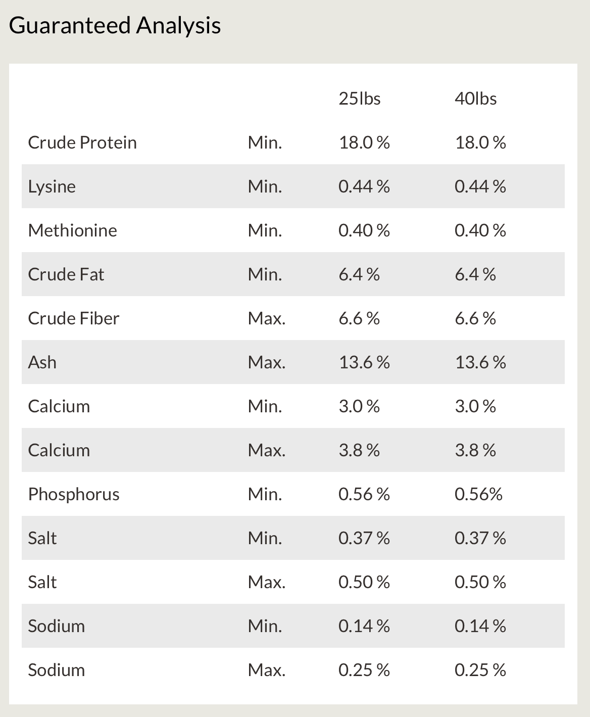 Organic Sesame Meal, Organic Wheat, whole, Organic Barley, whole, Organic Peas, Organic Milo, whole, Organic Sunflower Seed, whole, Organic Oats,whole, Ground Limestone, Organic Sun-dried Alfalfa Pellets, Organic Wheat Millrun, Organic Flaxseed, Monocalcium Phosphate, Diatomaceous Earth, Organic Kelp, dried, Hydrated Sodium Calcium Aluminosilicate, Sodium Aluminosilicate, Salt, Organic Tagetes Meal (Aztec Marigold), DL-Methionine, Organic Flavors(Garlic, Horseradish, Anise Oil, Juniper Berries Oil), Choline Chloride, Hydrolyzed Yeast, Ferrous Sulfate, Manganese Oxide, Zinc Oxide, Niacin Supplement, Copper Sulfate, Sodium Selenite, d-alpha Tocopheryl Acetate, Riboflavin Supplement, Calcium Pantothenate, Vitamin D3 Supplement, Vitamin A Supplement, Pyridoxine Hydrochloride Dried Talaromyces Versatilis Fermentation Product, Vitamin B12 Supplement, Menadione Nicotinamide Bisulfite, Ethylenediamine Dihydriodide, Folic Acid, Biotin.